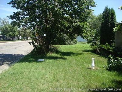 The little Marian shrine's pretty much undamaged. The debris is mostly pieces of trees that were cut into manageable lengths. July 25, 2011.